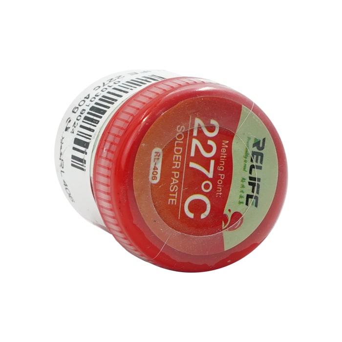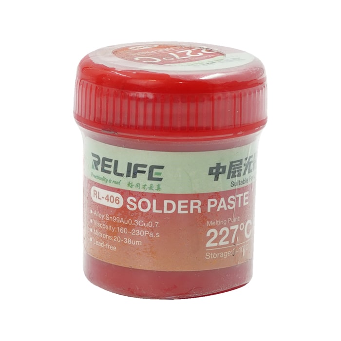 خمیر قلع ریلایف RL-406 – ابزاری بسیار کاربردی در انجام کارهای لحیم کاری که باعث بالارفتن کیفیت و سهولت در اتصال قطعات بر روی برد می‌شود. این محصول با دارا بودن نقطه ذوب 227 درجه ابزاری بسیار مناسب برای تعمیرات لایه های برد گوشی های آیفون 12 که از چندین لایه ساخته شده اند است. خمیر قلع ریلایف علاوه بر پاک سازی سطح قطعات ،از اکسید شدن قطعات لحیم کاری شده نیز جلوگیری می‌کند. همچنین با استفاده کردن این محصول در تعمیرات از آسیب رساندن به قطعات نیز در امان خواهید بود.