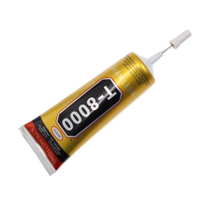 چسب T-8000 یکی از بهترین چسب‌های مخصوص چسباندن تاچ و ال سی دی و فریم در تعمیرات موبایل است. این چسب بی رنگ بوده و همانطور که در عکس مشاهده میکند چسب آن توسط یک سوزن از داخل جعبه خارج میشود و مخصوص قطعات ریز و حساس است.